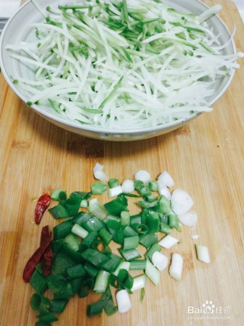 将萝卜切丝、小葱切段,红辣椒洗净备用。