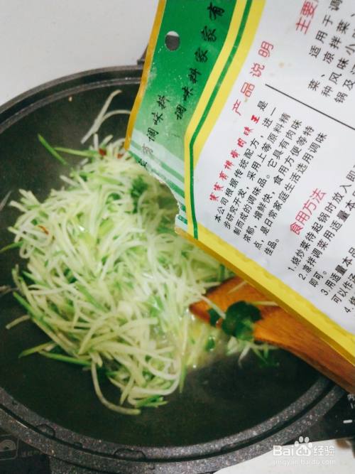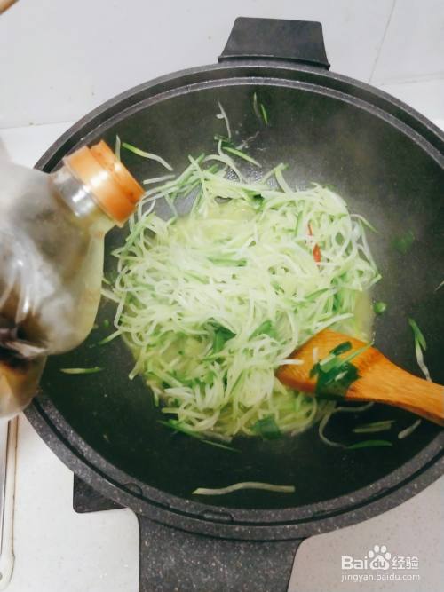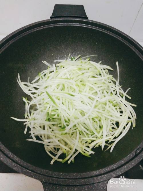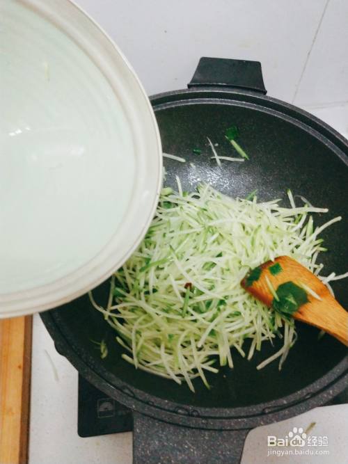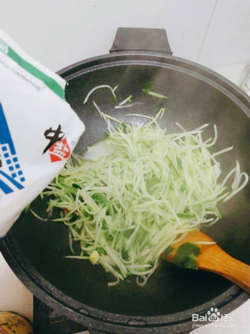 倒入准备好的萝卜丝翻炒,然后加入一点点开水防止粘锅。