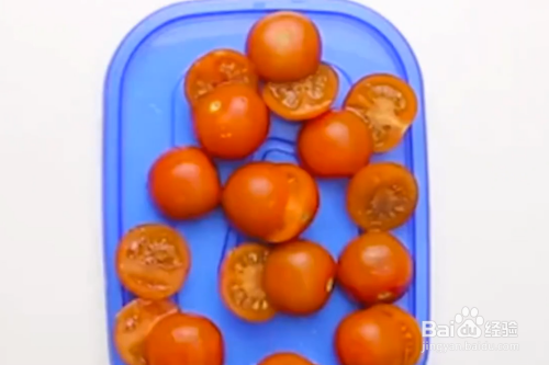 用力按住盖子,从侧面切过去,小番茄就切好了。