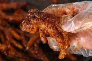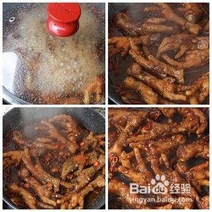 锅中放多点食用油,油温5成热时下鸡爪小火炸,鸡爪下锅马上盖锅盖,因为会有一点溅油哦,炸至金黄捞出备用。