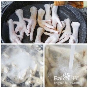 锅中放冷水,鸡爪冷水入锅,加料酒去腥,大火煮开后再煮3分钟左右捞出用冷水清洗干净,沥干水分放入碗中