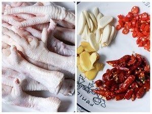 所有食材洗净,姜蒜切片,小米椒及干辣椒切段,鸡爪切掉指甲