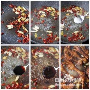 锅中留适量底油,下姜蒜及干辣椒,小火爆香,加适量清水,放半勺盐+2勺生抽+1勺耗油,搅拌均匀,煮沸后倒入炸好的鸡爪,水量没过鸡爪即可。