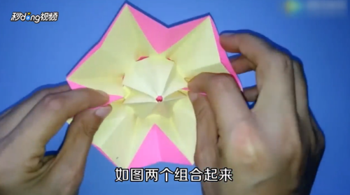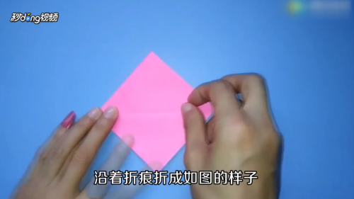 15*15cm正方形彩纸折成米字形,沿着折痕折成小正方形。