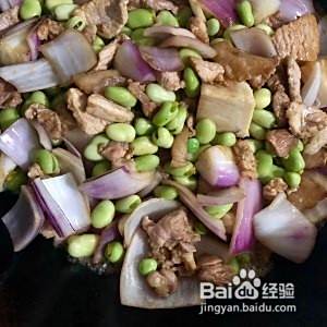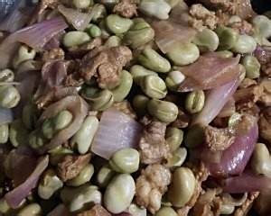 洋葱爆香后,把蚕豆倒入锅中,加酱油,大火翻炒均匀后,加入适量清水,盖上锅盖焖煮。