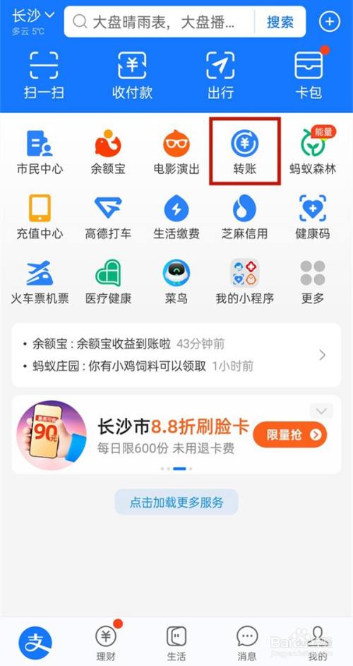 打开支付宝,点击转账。