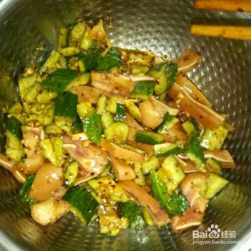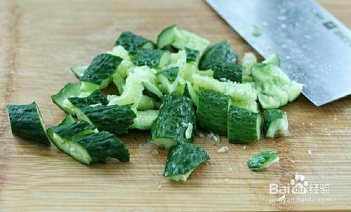 黄瓜洗净,拍碎后切成段,放入盆中。