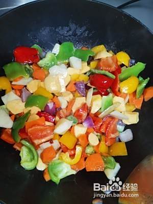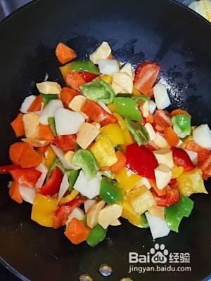 4土豆红薯胡萝卜,红黄绿太空椒,六种菜混合在一起,倒入比平时炒菜少些的油,一点点盐(盐千万别多),少许黑胡椒粉,