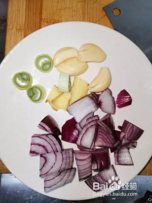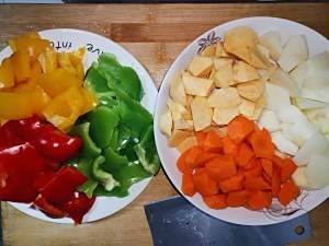 葱姜蒜和洋葱切好备用,土豆红薯胡萝卜去皮切滚刀块,红黄绿辣椒切块
