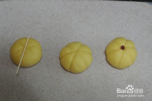 用牙签压出3条线,平均分成六等份,稍微整形,让南瓜的造型更圆润,中间插上一颗蔓越莓干