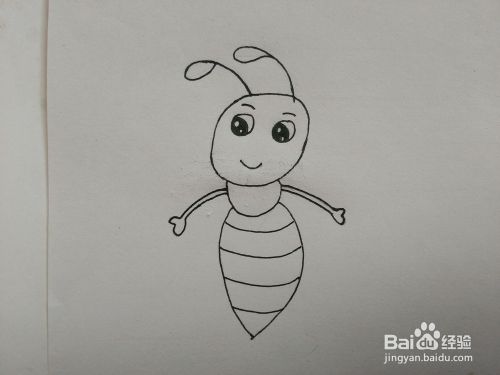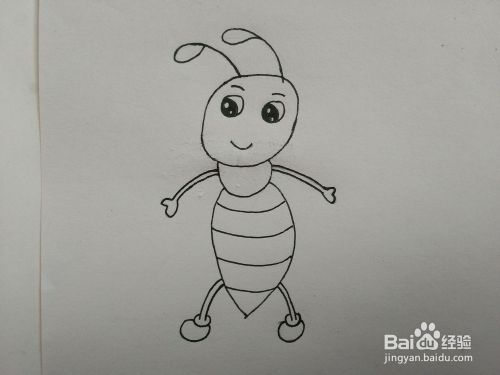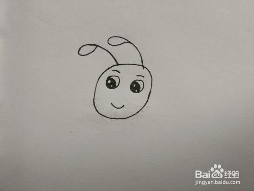 接着画出蚂蚁的弯弯的眉毛,圆圆的眼睛,弯弯的嘴巴。