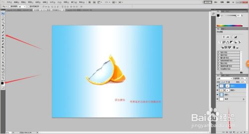 最后一步添加阴影。首先在橙子的下方新建一个图层,然后使用渐变工具,选择径向渐变,选择前景色到透明渐变,在橙子下方拽出一个圆,然后按住ctrl+t变化,变好之后复制图层ctrl+j,再用吸管工具吸橙子的颜色,把其中的一个图层变成橙色,然后同时降低不透明度,按住shift选中俩个图层变化。如图!