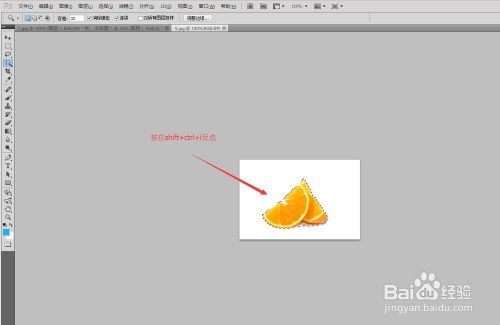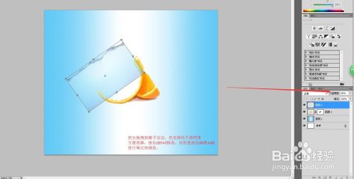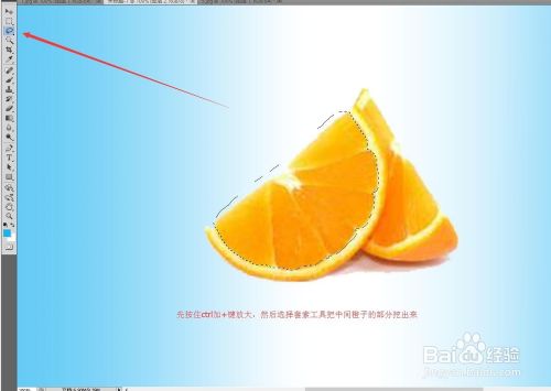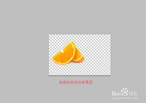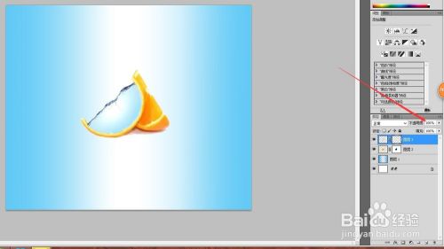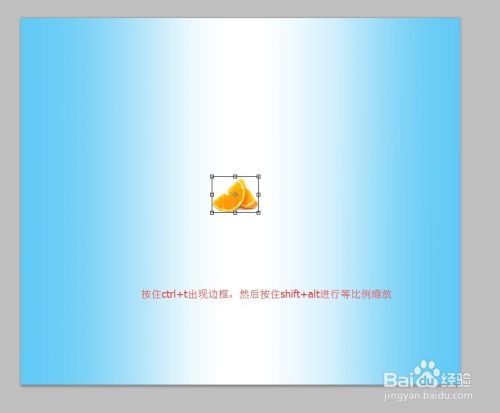 点击左上角的文件打开橙子的素材图,我们使用魔棒工具点击橙子,按住shift+ctrl+i反选,按住ctrl+j复制图层,然后把右侧的背景删除,只剩下橙子。点击移动工具把橙子拖拽到做好的蓝白相间的背景图中,然后按住ctrl+t框选,再按住shift+alt进行等比例缩放,放大橙子。