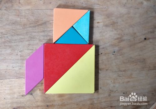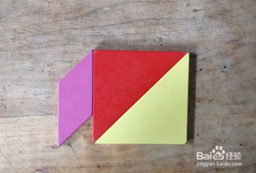 摆上余下的小三角形,放在小三角形的右侧挨着,直角向左,如图。