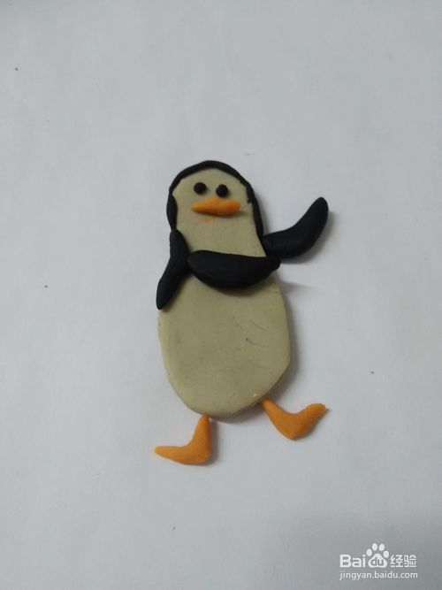 用桔色搓两个小条,从中间折一下,粘在身体下面,表示小企鹅的两只脚,跳舞的小企鹅就做好了。
