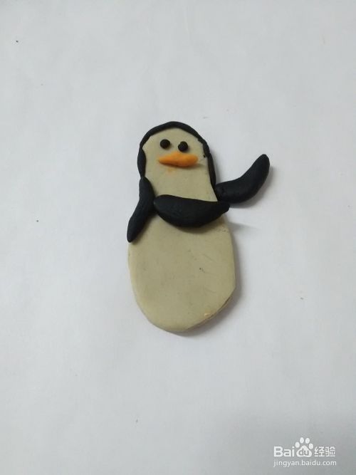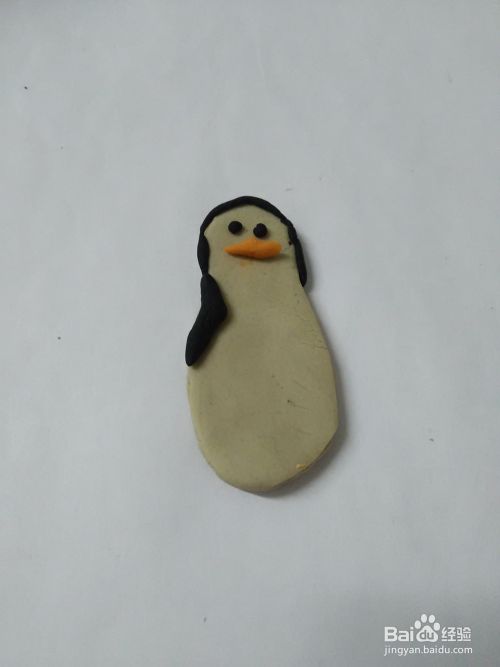 用黑色捏两个半圆形,粘在小企鹅的身体中间和右侧,表示它的两只翅膀。