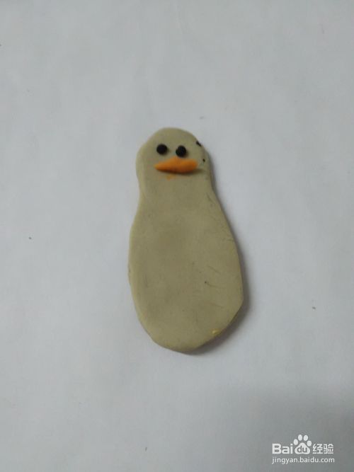 用桔色捏一个三角形,粘在两只眼睛下面,表示小企鹅宽宽的嘴巴。