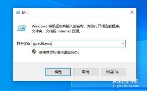 然后在打开的Windows10 运行窗口中输入命令gpedit.msc,点击确定按钮运行该命令。