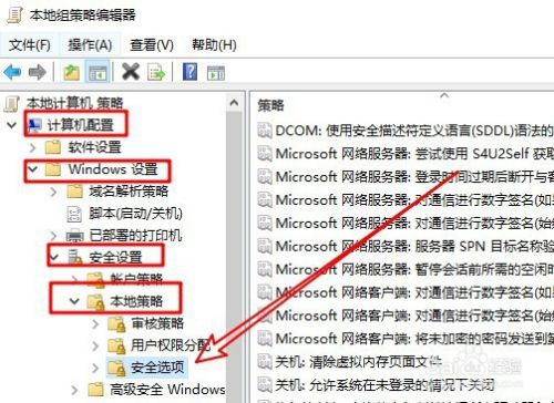 接下来在打开的Windows10的本地组策略编辑器窗口中依次点击“计算机配置/Windows设置/安全设置/本地策略”的菜单项,然后点击“安全选项”的菜单项。