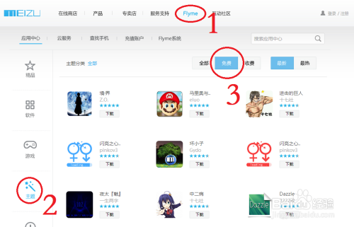 打开魅族官方主页,点击页面上方的“flyme”,然后点击页面左下方的“主题”,最后点击“免费”,则可以看到所有的免费主题。