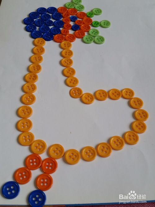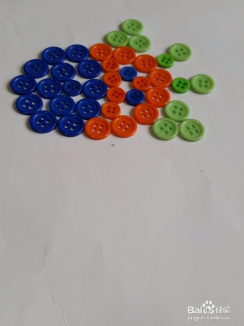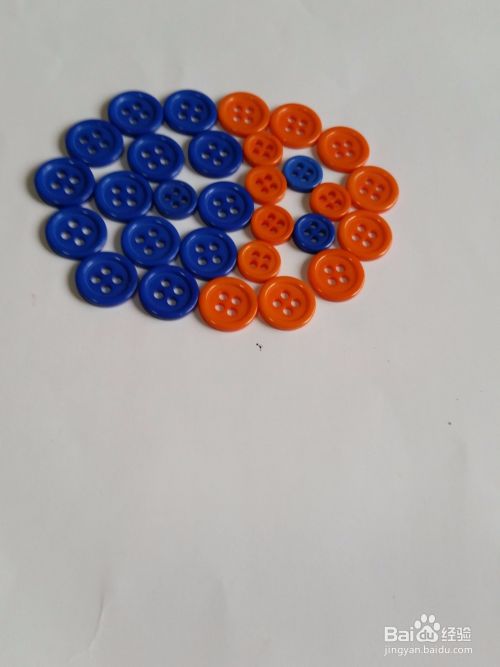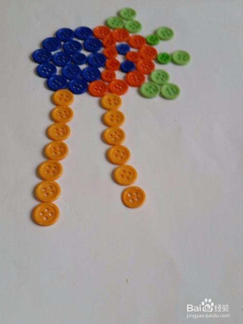 然后我们再用桔色的纽扣拼出小鹿的头,在中间放上两颗蓝色纽扣做眼睛