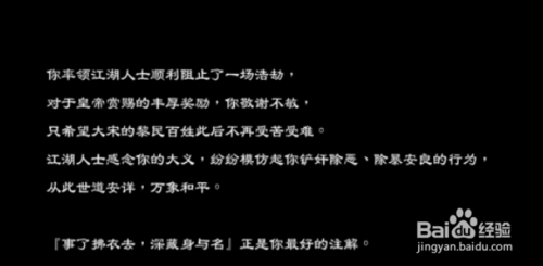 这里我重点说的是:我没有完成任何一个支线(除非是挡在我的路上的,但印象里没有,连出门小妤女侠给爆竹我都没有完成。),并且达到了武林兴盛。也就是说。师父,小樱,甚至飞白和剑锋的掌门我都给弄死了。而我只做到了一件事,和主线相关的,我一个都没有点错。