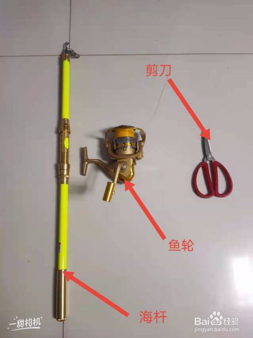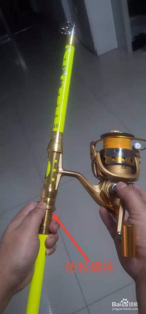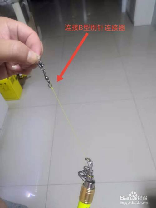 将鱼线从海竿的每一个导线孔穿出,直至竿稍,在鱼线上连接B型别针连接器。
