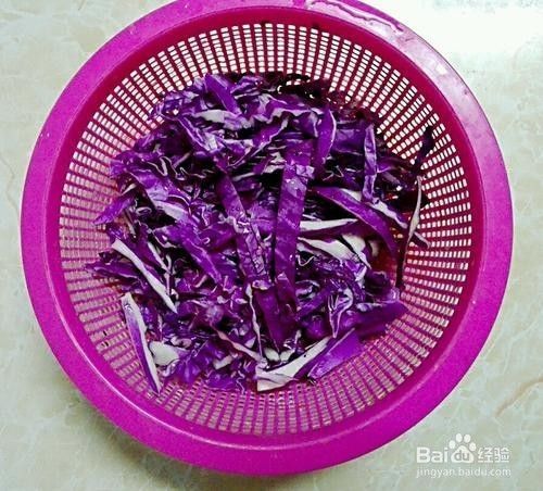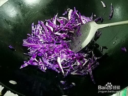 6.锅预热,放入油,油温热后放入紫甘蓝大火快速翻炒,再加入几滴醋,然后加入盐炒均匀,即可盛出