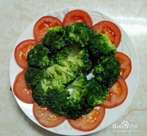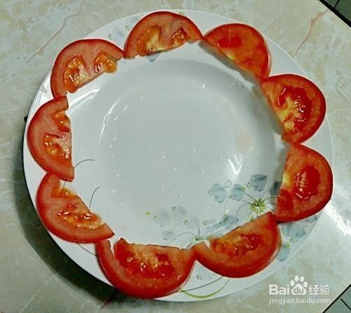 1.番茄洗干净,从中间切开两半,然后切成一片片的,摆在盘中。