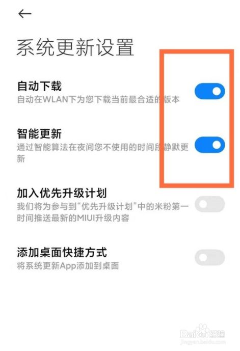 3、点击“系统更新设置”,将自动下载和智能更新后面的开关关闭即可。
