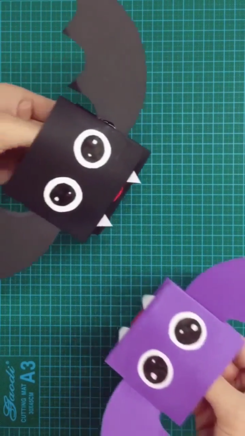黑色卡纸剪出蝙蝠的翅膀,将剪好的纸粘在折好的黑色卡纸上即可。