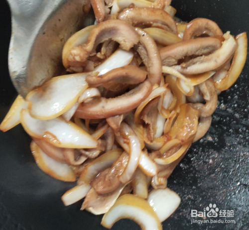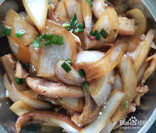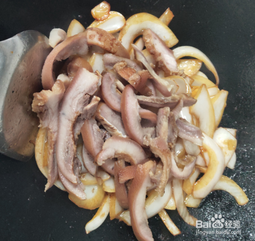 洋葱炒软后加入切成薄片的猪头肉一起翻炒。