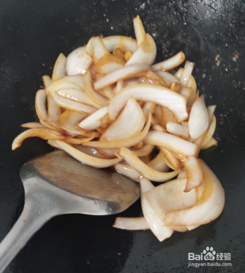 热锅少油,加入洋葱爆炒。将叠在一起的洋葱炒散,炒软。