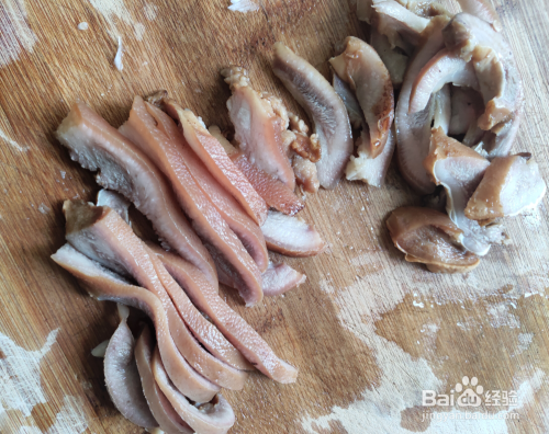 取出猪头肉,沥干水份,冷却后用刀切成薄片。备用。