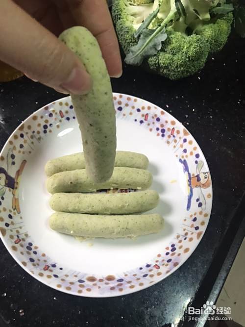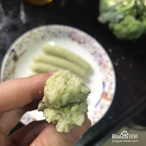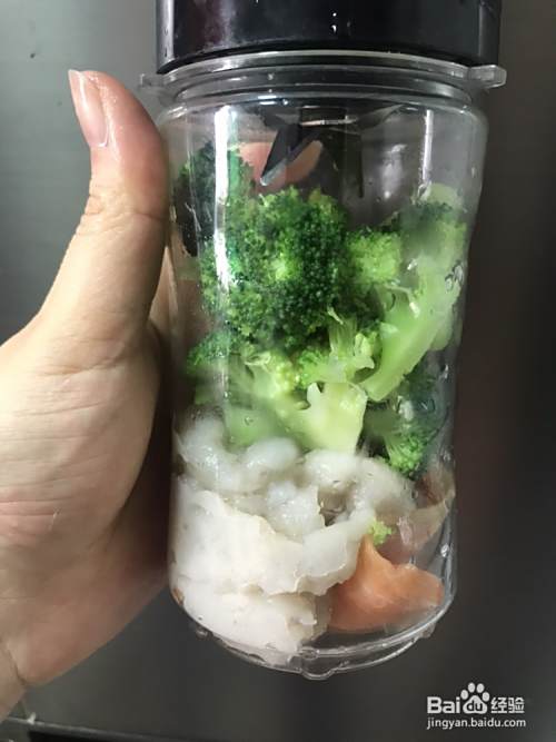 三文鱼肉、虾仁、鸡蛋一、西兰花放入榨汁机(或搅拌机)打匀,不加水,然后打开盖子,加入1勺淀粉(玉米淀粉)和少许盐(1岁以下不含盐),再次搅拌