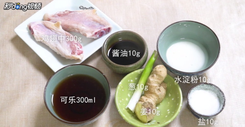1食材展示:鸡翅中300g、可乐300ml、酱油10g、葱10g、姜10g、水淀粉10g、盐10g。