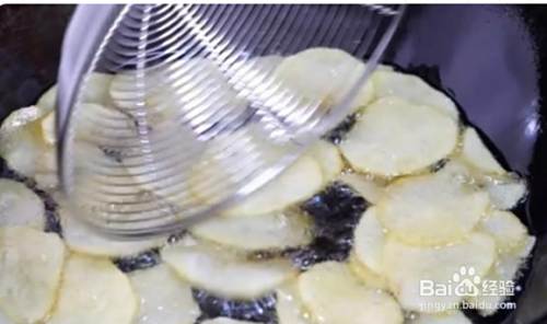 起锅烧火,倒入食用油,食用油的量尽量多一些,大火将油烧热,等到油温大约五成热,我们改成中小火,然后把沥干水分的土豆片倒入锅中开炸,少量多次将土豆片轧制金黄捞出。