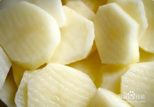 土豆去皮清洗干净,将土豆切成薄片,土豆片切的越薄越好,切好之后我们把土豆片放在一个盆中,然后倒入清水,再放入少许食用盐,将土豆片放在盐水中浸泡10分钟。
