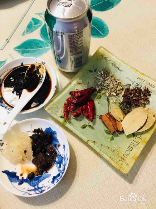2准备黄豆酱一勺,生抽30克、老抽30克、料酒20克调成料汁备用,准备15克冰糖一勺红糖、备花椒麻椒各5克,适量干辣椒小茴香、桂皮二段、香叶三片、啤酒一瓶备用,(吃辣的可以多放点干辣椒)