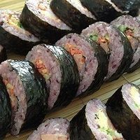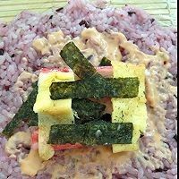 在竹帘上铺上保鲜膜,铺上米饭,涂上千岛酱或者沙拉酱,在加上自己喜欢的食材。包起来就完成了。