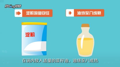 锅内放菜籽油,烧至八成热,将裹好淀粉的鱼下锅炸至两面金黄色,捞出备用。