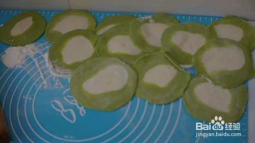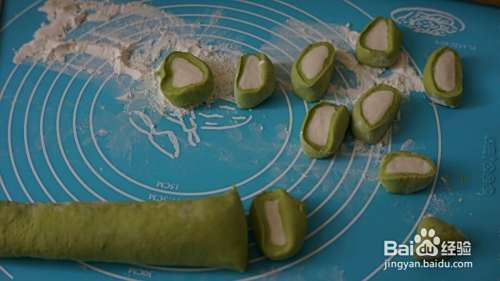 这里忘记拍白面粉部分,150克面粉加100克水揉成白面团,把绿面团擀成长片,白色搓成圆条