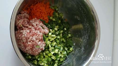 250克肉沫加上韭菜和胡萝卜,再放入所有馅儿的调味料,顺时针搅拌上劲