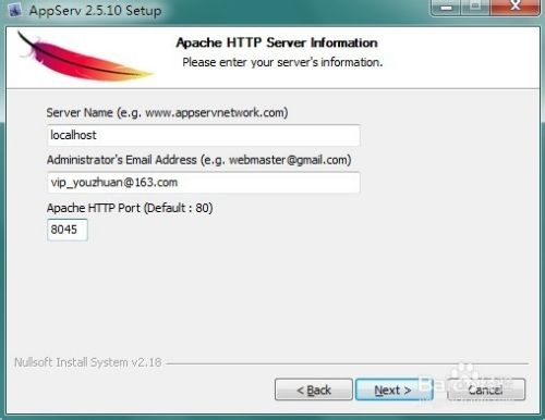 【其实只需要随便写个Email就行,最后一个填空Apache http port(default:80)意思是Apache服务器使用端口设置,默认情况下是80,这里我写的是8045,因为我电脑已经装过了其他平台的web服务,已经把80 端口占用,所以写了8045,你们安装的时候空着,只写个Email就OK】然后继续NEXT