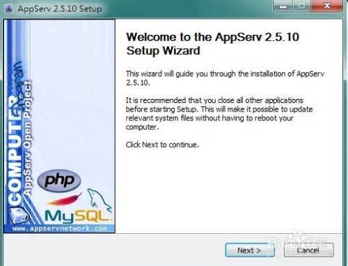 下载完后,开始Appserv安装,安装一个exe后缀的应用程序别告诉别人你不会,或者说那软件是English,俺不会阴沟里希。如果真心有这样捣蛋的家伙提这样的问题,黄梦龙 会在被气疯后教它记住一个长的这样的东西“NEXT”,猛点“NEXT”,即可!