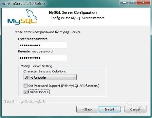 到了这里又NEXT不动了是吧,这里是让你填写数据库管理员密码跟mysql编码。设置phpmyadmin的root密码、character sets and collations 按照截图选择UTF-8、不作解释、接触到后面、即能晓得、打钩Enable innoDB、都ok就的NEXT。