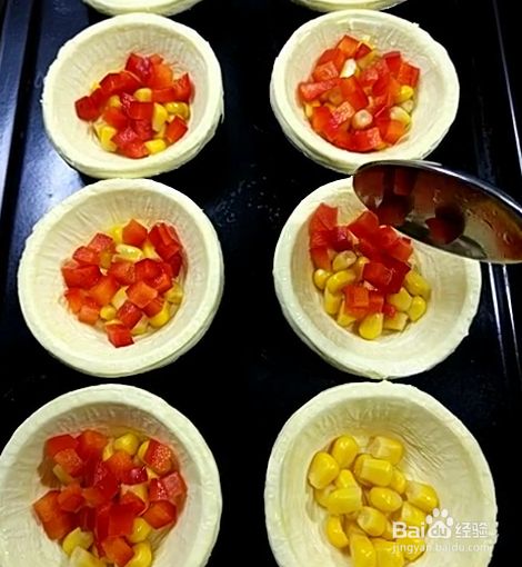 在每个蛋挞皮里面放入煮熟的玉米粒,红椒丁;