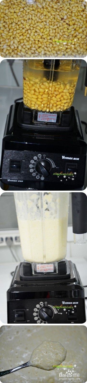 1、 提前将黄豆清洗干净,浸泡10个小时,让黄豆均匀吸收进水分 ;将泡好的黄豆放入破壁机,加入适量水分,按动用“瞬转”开关的方式进行搅打,约四五秒钟即可达到理想效果,无需打的太碎,口感就会差了;