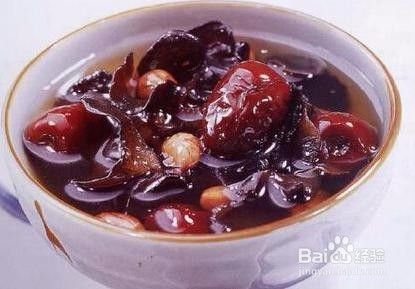 用黑木耳、枸杞、红枣,红糖放入锅中,加入适量的水一起煮20-30分钟,经常服用,可有效祛除黑眼圈,如果加入生姜还可以缓解寒淤血淤型的痛经。