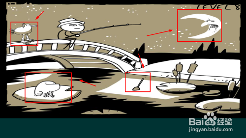 通关方法:点鸟、月亮、青蛙,再点浮标(这个顺序摸索好多遍才摸索出来。)